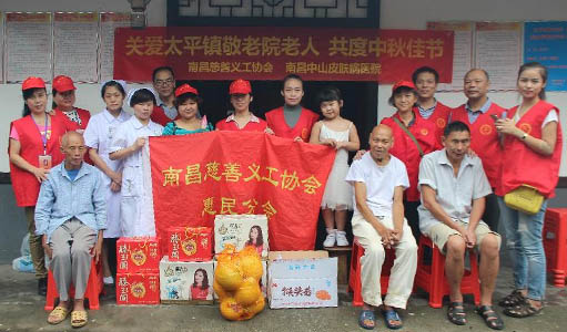 2016年9月11日,南昌慈善义工协会携手南昌中山皮肤病医院医护人员前往南昌市湾里区太平镇敬老院看望那里的孤寡老人,为他们送去了月饼、柚子、饮料、饼干等过节物品,南昌中山皮肤病医院医护人员为老人们做了健康检查【详细】