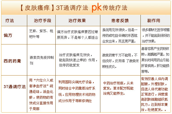 “3T通调疗法”根据中医“病在肌肤,根在血液,治血必治脏”的理论,采用医外治法(穴位介入、净血疗法)、免疫调节系统和中药熏蒸法完美融合的中医治疗理念,采用现代生物工程技术与中医的草本化和西医的现代化联合应用。针对各种不同原因所致的皮肤瘙痒,皮炎、湿疹、荨麻疹,采用个性化临床治疗方案,可以彻底治疗各种皮肤瘙痒,皮炎、湿疹、荨麻疹。
