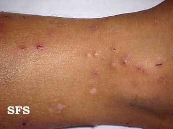 丘疹状荨麻疹又称荨麻疹性苔藓(lichen urticatus)、婴儿苔藓(stroophulus infantum)或小儿荨麻疹性苔藓,是婴幼儿常见的过敏性皮肤病,临床特点为散在性,性质稍坚硬,顶端有小疱的丘疹.周缘有纺锤形红晕,自觉瘙痒.