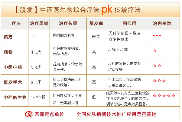 针对脱发“中西医生物综合疗法”是南昌中山皮肤病医院在总结传统中医治疗经验的基础上,融合西医治疗理念,采用现代生物工程技术提取的天然生物制剂,取代传统中药或西药的单一应用,融合中医内服外用,调理血气的理论、使中医的草本化,西医的现代化结合在一起。可针对各种不同病源和进程的脱发,采用个性化临床治疗方案,多管齐下彻底治疗脱发疾病。