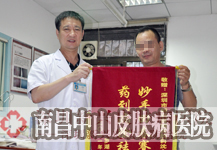 2011年5月29日,李先生来到南昌中山皮肤病医院,得到皮肤科专家沈朝禄主任的亲自诊治。“他是真菌感染,当时手脚都很重,以前在外边治疗好多次好多年,都没信心了。从第一次接触,我跟他说了治疗方案方法,他感觉很有道理,很可靠可信,他就在这里很配合治疗,治疗以后感觉挺好。今天专程来表示感谢,要给咱们送锦旗。”