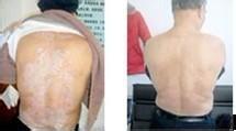 在陈先生的全力配合下,一个月内鳞屑颜色越来越淡,背部和上肢鳞屑消退大部分,下肢鳞屑也由边缘开始向内缩小。第二个月,陈先生身上的鳞屑已基本全部消退。为保证不再复发,主治医师又继续为他进行了一个疗程的巩固治疗。