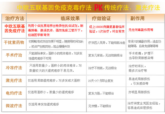 技术原理:以往治疗尖锐湿疣的方法, 不论是干扰素还是手术、冷冻、激光、 电灼、微波等,最大的技术瓶颈在于, 它们都只能去掉体表疣(疱)体,而并 不能清除深藏在人体内的hpv/hsv病毒, 所以,在治疗后疾病会不断的反复发作, 令患者苦不堪言。