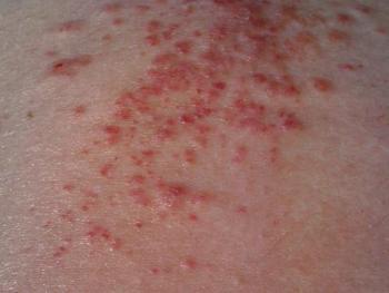 渗出性湿疹多发生于肥胖有渗出性体质的患者。发生湿疹时,初起于两颊,发生红斑、境界不清、红斑上密集针尖大丘疹,丘疱疹,水疱和渗液。