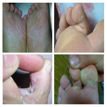 病例描述:张某双足泛发脚气病一年不到,双足底及各趾缝处皮肤粗拙干裂,足背及两侧亦然,干裂脱屑而搔痒,搔抓之处偶有渗血,沿抓痕处皮肤亦呈粗拙干裂, 疗灰指甲的偏方。起小疱疹,搔抓后则又无间伸张,至双足底、趾缝、足背均为干裂、脱屑。使张某痛苦到了极点。张某曾利用“抗菌素”、外涂“达克宁”、“酮 康唑”、“益康唑”及皮炎宁酊类均无彰着效果,症状如故。病情仍然不见好转。