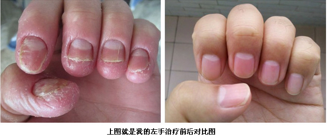表现症状:张先生由于经常到洗脚店洗脚,感染了脚气,由于没有引起重视疏于治疗,没过多久,又感染上了灰指甲。这几年经过多次芍物治疗,不但没有好转,反而逐渐扩展,手上被传染了8个灰指甲,脚上也被传染了4个趾甲。