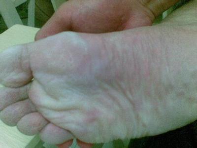 刘先生,39岁,南昌人患有手足癣半年多一年前一次洗脚时发现脚底有几个小暗红点不疼不痒当时没太注意,以后小红点开始扩散。出现针尖到针头大小的深在水 疱,并且开始发痒。后到当地皮肤病医院,当地大夫诊断为:掌趾脓疱病给予药膏治疗,用了之后有所见效,心里非常高兴。可是没过几天就又复发了,接着抹药 膏;就这样反反复复最后抹药膏也不管用了而且面积也扩散了非常痒越痒越抓越痒。经常挠的出血也不解恨,尤其是到晚上痒的厉害,严重影响了睡眠质量,实在是 痛苦。