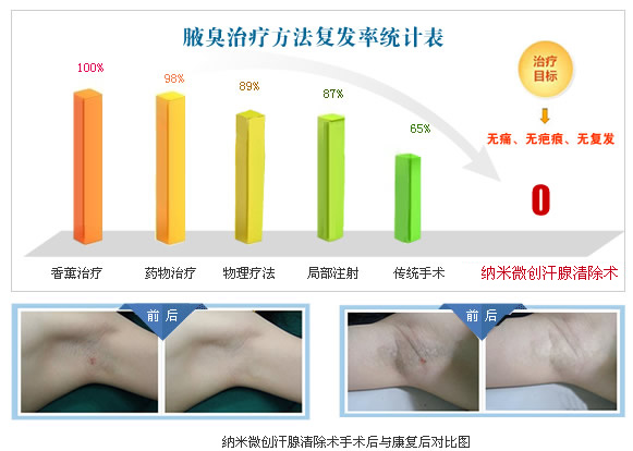 “纳米微创汗腺清除术”可从根本上性清除产生异味的大汗腺,改变了治疗腋臭的传统治疗破坏大容易复发的难点。因为它安全、可靠、无痛、不改变皮肤外观,保 证治疗效果。对经激光、手术、外擦药、电离子烧灼、硬化剂注射等治疗失败者,治疗更有效,临床多年随访及遗传患者未见复发,是目前治疗腋臭的理想方法。