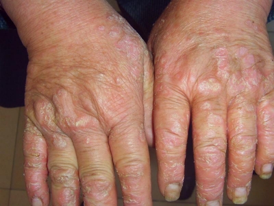 多由水疱鳞屑型发展而成。患者常有多年病史,累及双手,也可为单侧。皮损一般无明显的水疱或环形脱屑。掌面弥漫性发红增厚,皮纹加深,皮肤粗糙,干而有脱屑。冬季则常发生开裂,有时裂口很深伴出血,疼痛难忍,影响活动。促使手掌角化增厚的因素除皮肤癣菌外,还与长期搔抓、洗烫,肥皂、洗涤剂、各种化学物品和溶剂刺激以及不当治疗有关。