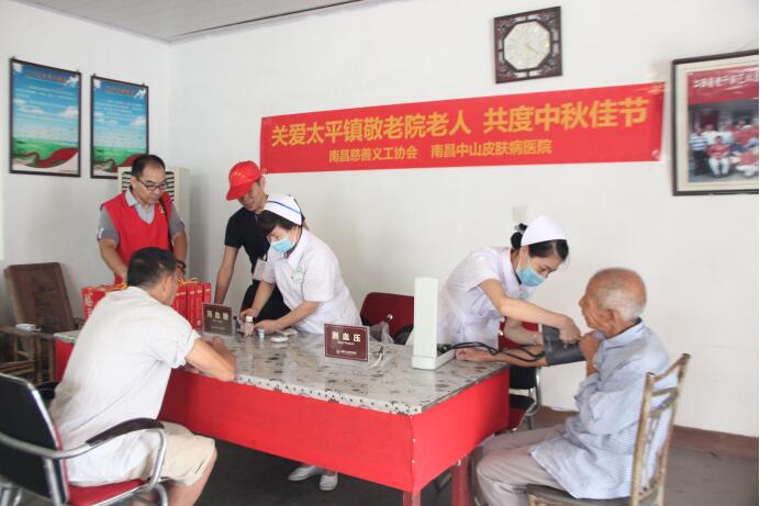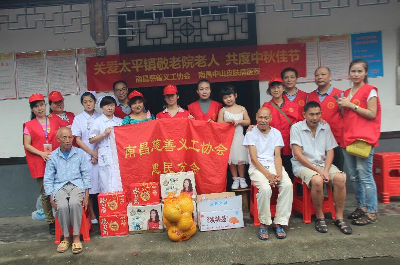 尊老、敬老、助老、孝老是中华民族的传统美德,也是构建和协社会的基础。在中秋佳节来临之际,为弘扬这一传统美德,2016年9月11日,南昌慈善义工协会携手南昌中山皮肤病医院医护人员前往南昌市湾里区太平镇敬老院看望那里的孤寡老人,为他们送去了月饼、柚子、饮料、饼干等过节物品,南昌中山皮肤病医院医护人员为老人们做了健康检查,义工们为老人理发、整理卫生,并和他们一起,提前过了一个幸福团圆的节日,送上最真诚地祝福。